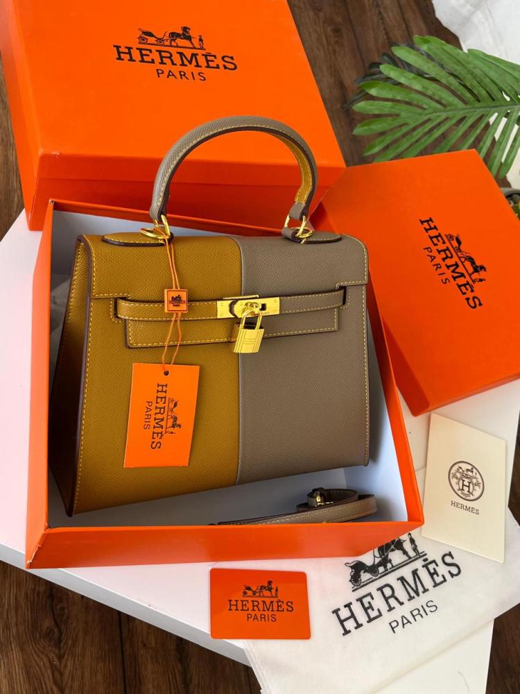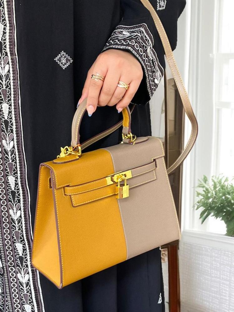 شنطة رمادي من مجموعة Hermes Kelly تصميم يجمع بين الفخامة الكلاسيكية واللمسة العصرية الجريئة. اللون الرمادي الهادئ ينسجم بسلاسة مع الأصفر الخردلي ليمنحك قطعة استثنائية مناسبة للإطلالات اليومية أو الرسمية.