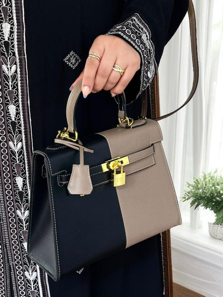 شنطه سوداء صغيره مصممة لتناسب ذوق المرأة العصرية تصميم مميز من Hermes Kelly باللونين الأسود والرمادي الغامق يمنحك مظهرا متوازنا بين القوة و الأنوثة. مثالية للدوام أو المناسبات أو حتى الخروجات الكاجوال.